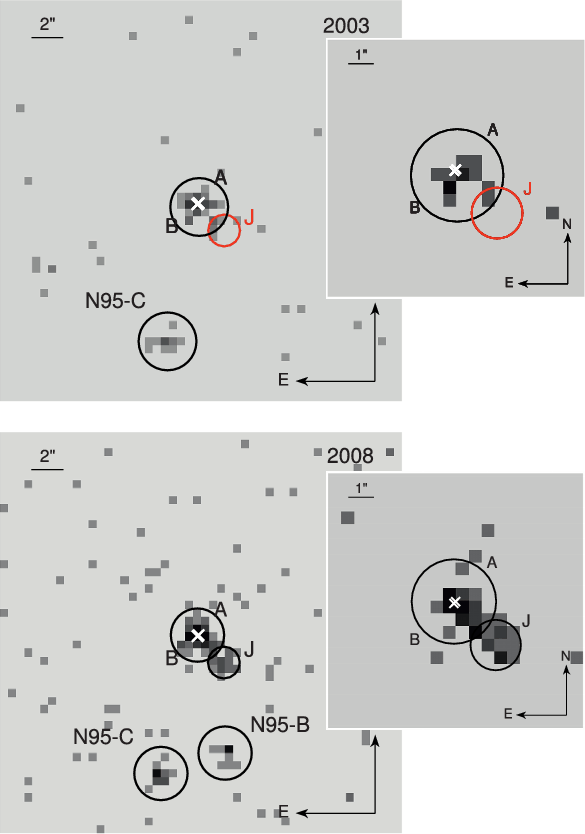 The upper limit to the count rate at this epoch does not exclude X-ray emission at similar levels as observed in the 2008 image. However, examination of the photon centroids