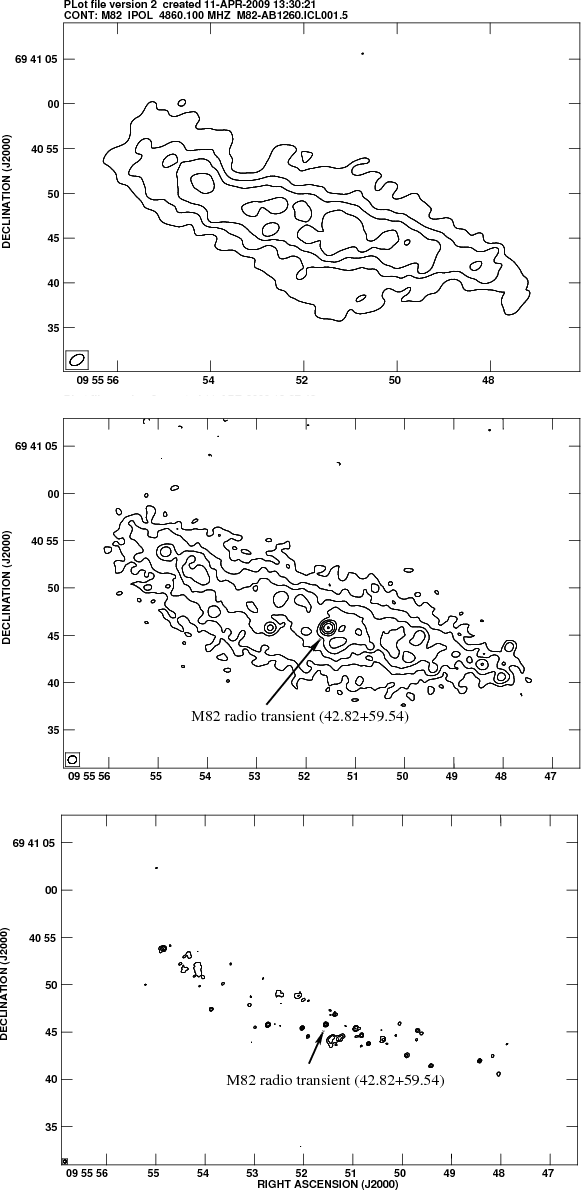 M 82 is a nearby (3.6 Mpc based on a Cepheid distance to M 81 by Freedman et al. 1994) irregular (I0) galaxy with a very active starburst in its nuclear region. It harbors many bright supernova remnants in its central region, which have been studied extensively for decades (Fenech et al. 2008; Beswick et al. 2006; Muxlow et al. 1994). van Buren & Greenhouse (1994) estimate a supernova rate of 0.1 year-1. However, a new radio supernova has not been discovered. Singer et al. (2004) reported a supernova in M 82 (SN2004am) that was classified as type-II (Mattila et al. 2004), but it has not been detected at radio wavelengths (Beswick et al. 2004).