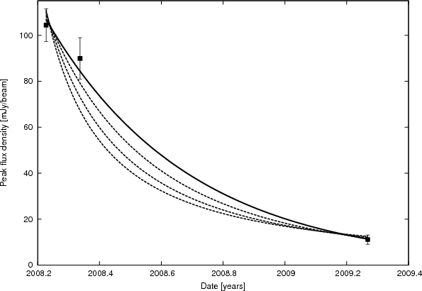 Figure 3: Lightcurve of the new radio transient from our observations (squares). Also shown are an exponential-decay fit (solid line) and power-law fits (dashed lines), assuming different peak times of the flare: 2008.0 (lower line), 2007.8 (middle line), and 2007.08 (upper line). |
