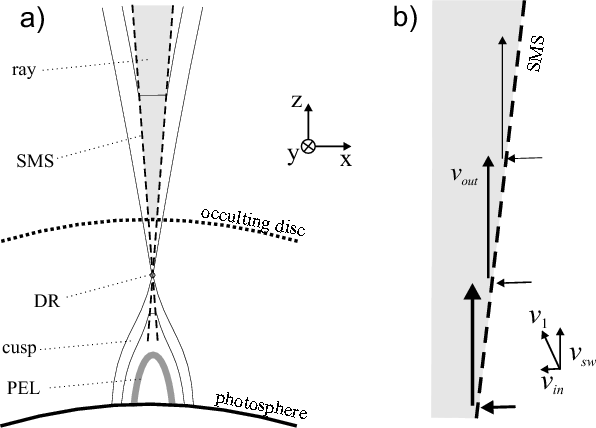 Since post-CME rays extend outward from cusped structures associated with growing post-eruption loop-systems, our working hypothesis is that they appear as a consequence of the reconnection in the CS formed in the wake of CME. Furthermore, we assume that the reconnection process can be described approximately in terms of the steady-state Petschek regime (Petschek 1964). In this regime, the reconnection takes place within a small diffusion region (DR), from which two pairs of standing slow-mode shocks (SMSs) extend along the axis of symmetry. Thus, the CS is bifurcated, SMSs separating the inflow and outflow region (Petschek 1964; Soward & Priest 1982). At SMSs, the inflowing plasma is compressed, heated, and accelerated, forming the upward and downward reconnection jet (Fig. 1). We note that electric currents are concentrated only in DR and SMSs.