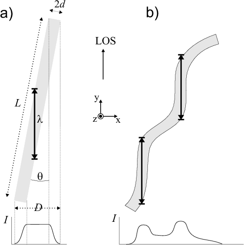 Dependence of the width and morphology of the ray at a given height on the orientation/geometry of the current sheet: a) straight CS; b) wavy CS. The CS half-thickness is denoted by d, horizontal length (i.e., the length in xy-plane, see also Fig. 1) by L, the ray width by D, and the inclination to the line of sight (LoS) by |