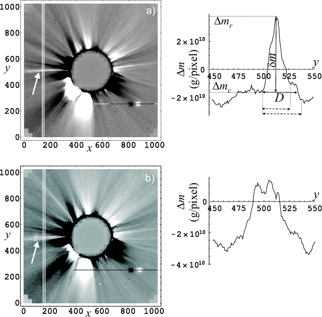 a) Simple post-CME ray (9 January 2002 at 06:06 UT); b) complex ray consisting of three radial substructures (9 January 2002 at 02:30 UT). The ray is marked by white arrow. The scale of the LASCO-C2 images is given in pixels (1 pixel corresponds to 11.9 arcsec). The column-mass profiles measured along the bin marked by white lines are shown in the right-hand panels (abscissa scale in pixels). Estimates of the ray width, D, and column-mass excess, |