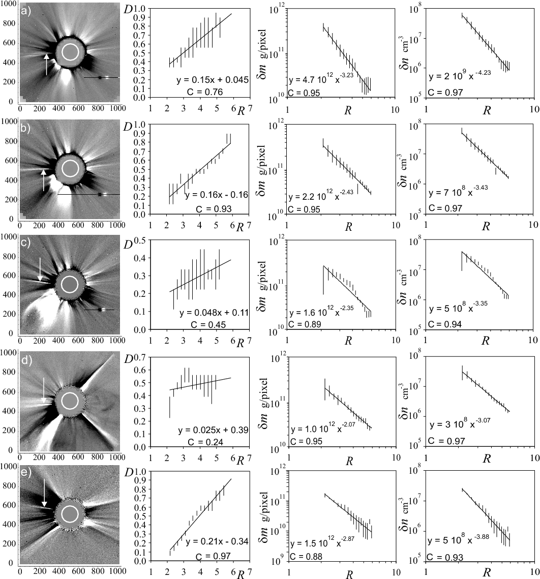 For a detailed analysis, we chose three post-CME rays, observed on 8-9 January 2002, 18 November 2003, and 26 June 2005. The events of 18 November 2003 and 26 June 2005 were selected as examples of relatively stable rays. In both events, we analyzed only one ray image (at 12:50 UT and 06:30 UT, respectively). On the other hand, the event of 8-9 January 2002 did exhibit significant activity, similar to that in the remaining eight events. This event was selected to quantify the level of variability in post-CME rays, and we therefore performed measurements at three different times (00:06, 06:06, and 12:06 UT). We note that the rays in the selected exposures did not have significant blob-like features or similar inhomogeneities, although they might have been present at earlier and/or later times.