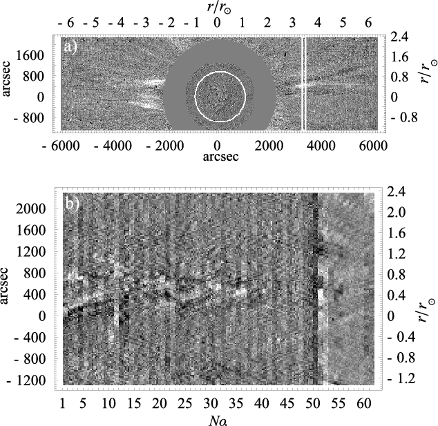 The profiles shown were measured in the LASCO-C2 difference-images along the bin marked by white