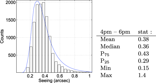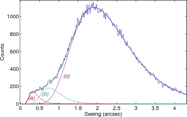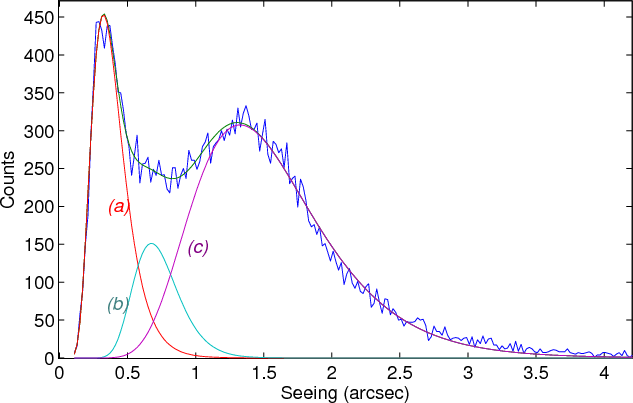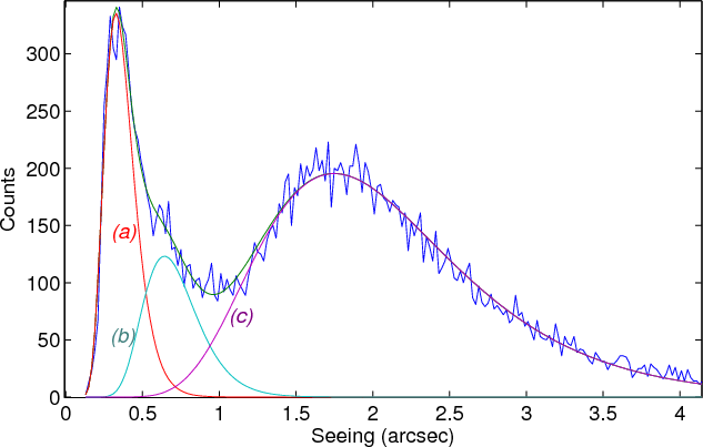 We attempted to model the histograms by a sum of two log-normal functions, but it failed in the dip between the two curves. A sum of three log-normal functions was required to obtain the good fit that is visible here. Figure 4, for comparison, is an autumn histogram, from 2007. It shows a very similar general behaviour: a poor seeing distribution, now peaked around 1.3 arcsec, a good seeing distribution still peaked at 0.3 arcsec, and a similar third component. The fitted functions are defined by