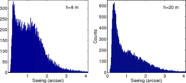 Figure 5: Histograms of the seeing obtained during the same 4 months in 2005 at 8 m and 20 m showing how much the seeing improves in this 12 m vertical interval. Quantitatively, they provide the probabilities of beeing above the SL at these two altitudes. |