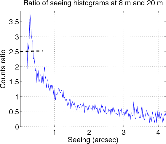 The left peak of the two histograms of Fig. 5 is expected to represent the same function, i.e. the ASL seeing PDF, as will be discussed in Sect. 2.5. There should only be a difference in the weight of these functions regarding the total seeing distribution (18% at 8 m, 45% at 20 m). Figure 6 shows the ratio (20 m/8 m) of the two normalized histograms. In its left part (i.e. for seeing values below 0.5 arcsec) it should tend towards the ratio of the two ASL PDFs, i.e. the ratio of two identical functions, which is a constant. This constant is the ratio of 45% to 18%, i.e. 2.5. However this expected saturation of the graph for small values (represented with the dashed line in Fig. 6) is not observed. Instead, we have a depletion for seeings between 0.1 and 0.3 arcsec, and too many points in the range 0.3-0.45 arcsec. The extreme values, around 0.1 arcsec, are missing at 20 m while they sometimes do appear at 8 m. Very likely, the seeing measurements made by this DIMM situated on the roof of the building suffer from the large amplitude mechanical vibrations created by this situation.