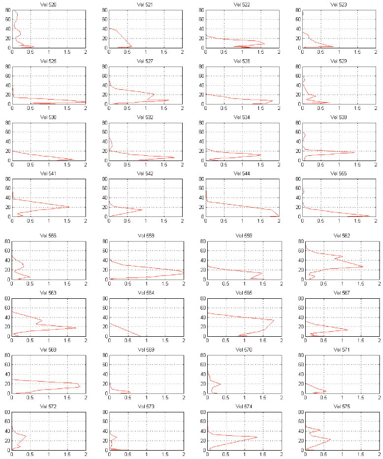 Figure 9: 32 samples of the SL Cn2 vertical distribution in the first 80 m above the ground, measured during winter 2005 by balloon radio soundings. The horizontal axis is Cn2 in units of 10-13 m-2/3 and the vertical axis is the altitude over the ground in meters. Note that the Cn2 is displayed in linear scale (it is often shown in log scale). |