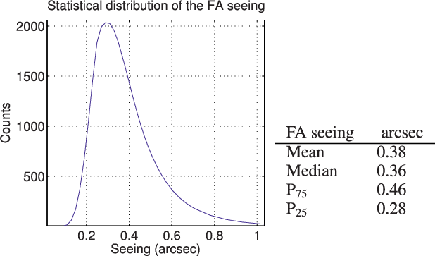 Daily and monthly averages of the seeing are plotted as a function of time in Fig. 1. We see a strong dependence of the seeing with the season. The best conditions are observed in the summer with a median of 0.54