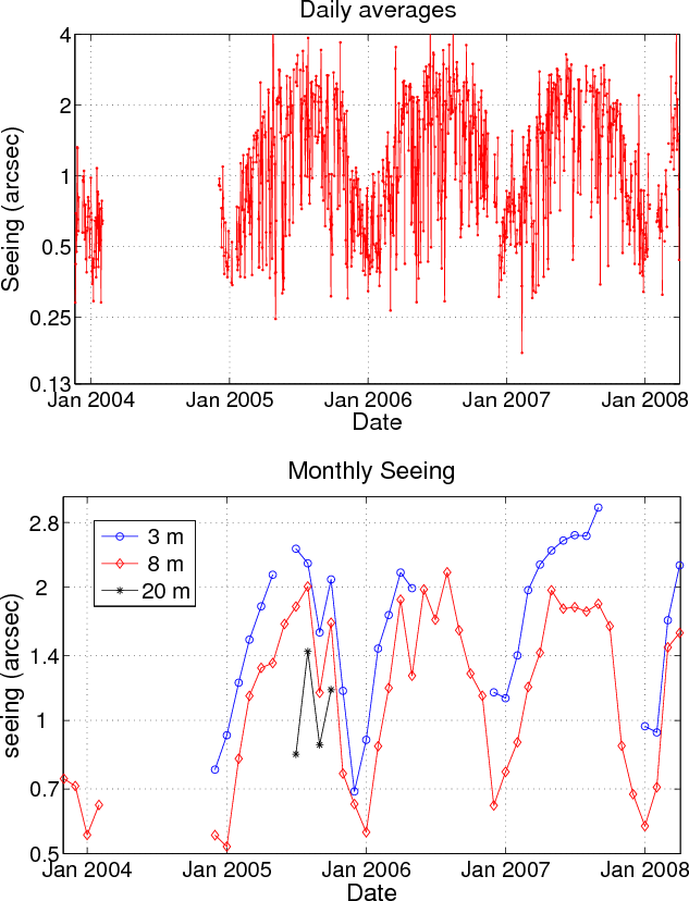 Figure 1: Top: daily average seeing at an elevation of 8 m as a function of time. Bottom: monthly seeing for the three elevations 3 m, 8 m and 20 m respectively. Seeing scale is logarithmic. |