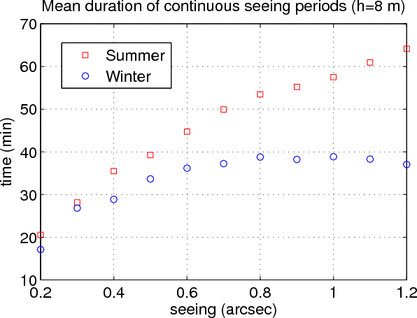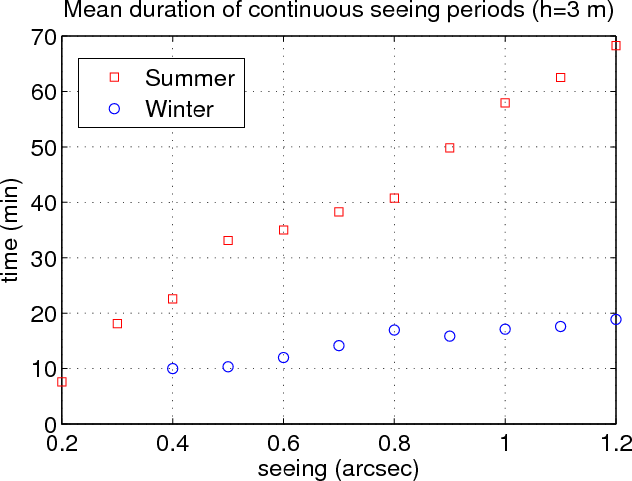 Figure 17: Histogram of the length ts of continuous intervals with seeing <s0, as a function of s0, for seeing data taken in summer and in winter with the DIMM at an elevation of 8 m. |
