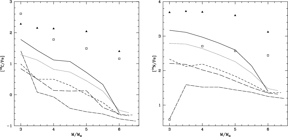 10-15 Gyr) and complete, at the bottom of their surface convective zone, an advanced stage of nucleosynthesis (Hot Bottom Burning, hereinafter HBB, Blöcker & Schönberner 1991; D'Antona & Mazzitelli 1996), the products of which should be carried to the surface by convective currents (Ventura et al. 2001). The medium in which this generation of stars evolved should thus show the signature of this