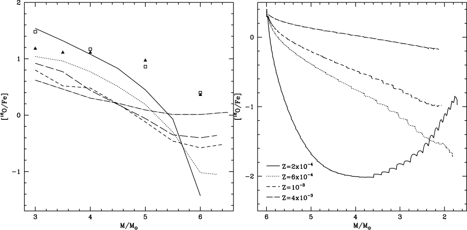 The paper is organized as follows. Section 2 describes the physical and chemical ingredients used to calculate the evolutionary sequences. The physical properties of the models are presented in Sect. 3. The chemical content of their ejecta, and its dependence on mass and metallicity, is discussed in Sect. 4, and compared with observations in Sect. 5.