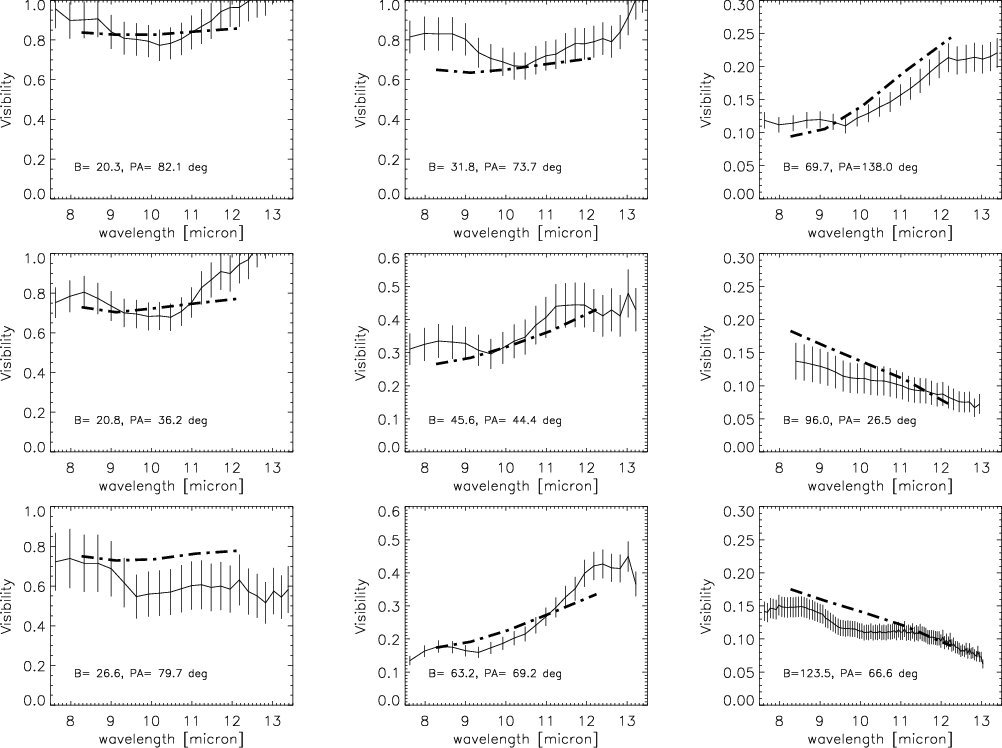 m feature, giving rise to a permanent spectrally dependent residual. Nevertheless, the two visibility curves acquired with the UTs, reaching 100 m, are less sensitive to these mismatches and more sensitive to compact structures that are not accounted for by the model. Noteworthy is that a small amplitude sinusoidal pattern is visible in the visibility curve of the longest baseline (
