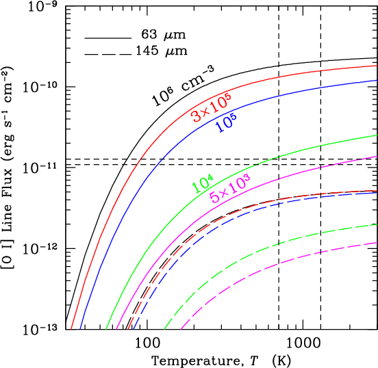 The diagnostic usefulness of H2 lines for the study of shocked gas has been discussed in detail by Neufeld et al. (2006, and references therein). It had also earlier been shown that Herbig-Haro (HH) flows, which are optical manifestations of interstellar shock waves, are strong emitters of [O I] 63