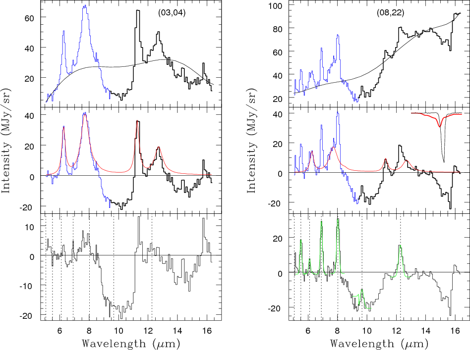 m thought to be due to polycyclic aromatic hydrocarbons (PAHs, Allamandola et al. 1985; Léger & Puget 1984). In order to extract the emission due to PAHs, we fitted a continuum below the PAH features and over the silicate absorption (Fig. 2). After subtracting the continuum, we fitted the PAH emission, assuming that each line profile can be described by a Lorentzian profile (Boulanger et al. 2005). The peak position and the width of each PAH feature are listed in Table 1.