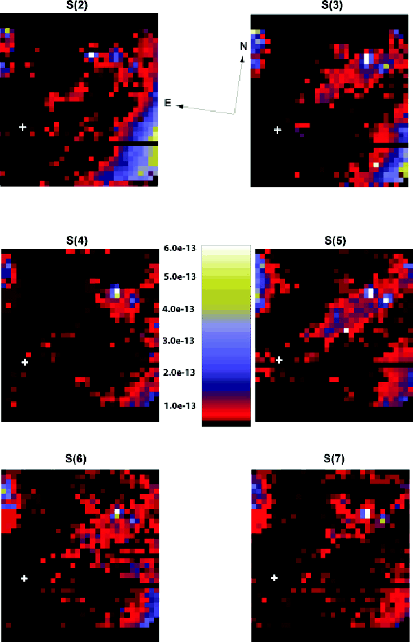 The residuals after fitting the PAHs show that in several pixels, there is a series of emission lines due to pure rotational transitions of molecular hydrogen, H2. The combination of SW and LW spectra made it possible for us to detect the transitions from S (2) up to S (7). These lines are not resolved at the resolution of the ISOCAM-CVF and were fitted using Gaussian profiles in order to estimate the line intensities (bottom right panel in Fig. 2). There are no detections of possible other line emitters, such as, for instance, [Ne II] 12.8