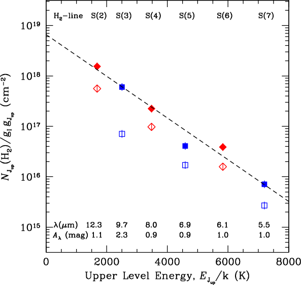 PDR (Habart et al. 2003; Hollenbach et al. 2009; Liseau et al. 1999; Spaans & van Dishoeck 2001; Kulesa et al. 2005). It should be noted that the sparse distribution of the S (4) line is due mainly to the strong contamination by the 7.7