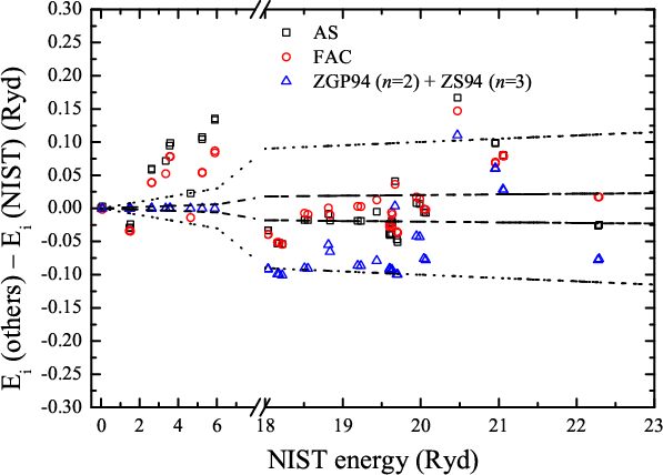 Figure 1: Theoretical energy levels from the present AUTOSTRUCTURE (AS) and FAC calculations, as well as those of Zhang et al. (1994), Zhang & Sampson (1994) compared with the observed taken from the NIST v.3 database. The dashed and dotted lines correspond to agreement within 0.1% and 0.5%, respectively. ( Colour online.) |