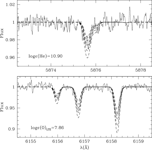 were obtained and the very weak He line at 5875 Å measured. We compared this feature with synthetic spectra to obtain He abundances. In addition, iron peak (Fe, Cr),