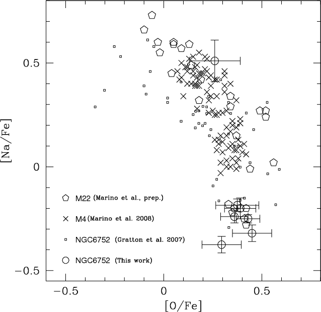 This hypothesis also can explain correlations or anticorrelations of light elements (i.e. C vs. N or Na vs. O, Marino et al. 2008) present at the level of unevolved stars (Gratton et al. 2001). On the other hand this phenomenon cannot be explained by evolutionary effects like deep mixing processes that happen in the RGB only after the first dredge-up or at the RGB-bump phase.