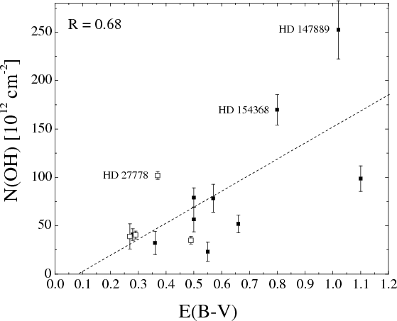 Figure 3: Relation between column densities of the OH molecule and interstellar reddening E(B-V). The OH molecule is probably not observed at E(B-V) < 0.08. With open squares we mark objects where column densities of the OH molecule were taken from the literature. |