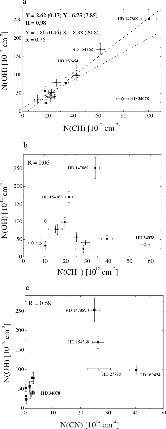 Figure 4: Column density of OH plotted vs. those of other simple molecular species: CH a), CH+ b) and CN c). Filled squares - our determinations of the OH abundance, open squares - literature data. To calculate correlation coefficients we used all the measurements in each case. In Fig. 4a with the dashed line we present the relation with one data-point excluded - HD 34078 (boldface). In this case the boldfaced relation is very good with the correlation coefficient equal to 0.98. |