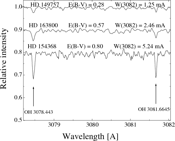 Figure 1: The OH molecule A-X system centered near 3078 and 3082 Å seen in spectra of 3 objects characterized with different E(B-V). Note the increasing equivalent widths of both 3078 and 3082 lines with the interstellar reddening. |