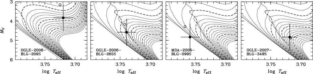 First we want to clarify the nomenclature used to describe microlensing events. The actual microlensing event is given a name depending on the project which discovered it (e.g., MOA or OGLE), year it took place, the direction in which the event occurred (in our case BLG for the Bulge), and a running number, e.g., OGLE-2008-BLG-209. When referring to the source star of the microlensing event an ``S'' is added to the event name, i.e., OGLE-2008-BLG-209S. Other extensions are given for the lens and for any planets orbiting the lens.