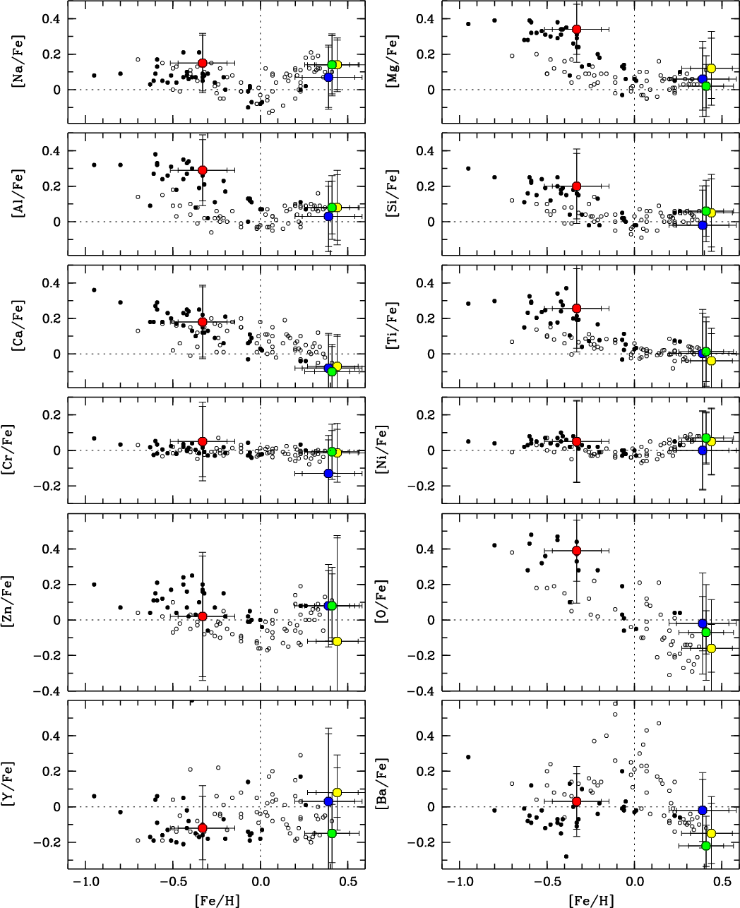 -elements, this is one of the main reasons why observational studies of the chemical evolution of the Milky Way are largely based on dwarf stars (e.g. Edvardsson et al. 1993). Also, because the spectra of the intrinsically luminous metal-rich giant stars have a very rich and often hard to identify fauna of molecular bands, great effort has to be made to identify un-blended and weak spectral lines (see, e.g., Fulbright et al. 2007). Furthermore, for species such as, e.g., Mg and Na, that only have a few usable lines that usually