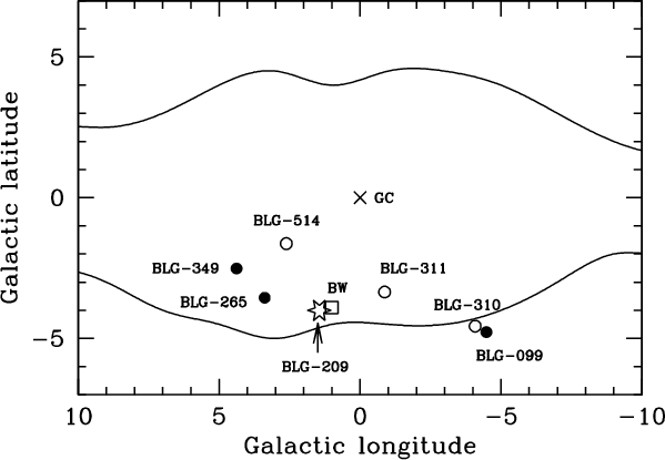 Figure 1: Dwarf stars in the Bulge for which high-resolution spectra have been obtained. Filled circles mark OGLE-2006-BLG-265S and MOA-2006-BLG-099S already published by Johnson et al. (2007) and Johnson et al. (2008), respectively, and OGLE-2007-BLG-349S published by Cohen et al. (2008). The ``star'' marks OGLE-2008-BLG-209S being analysed here for the first time, and the open circles mark OGLE-2007-BLG-514S, MOA-2008-BLG-310S, and MOA-2008-BLG-311S that currently are being analysed elsewhere. The curved lines show the outline of the Bulge based on observations with the COBE satellite. The open square marks the position of Baade's window (BW), and the Galactic centre (GC) is also marked. |