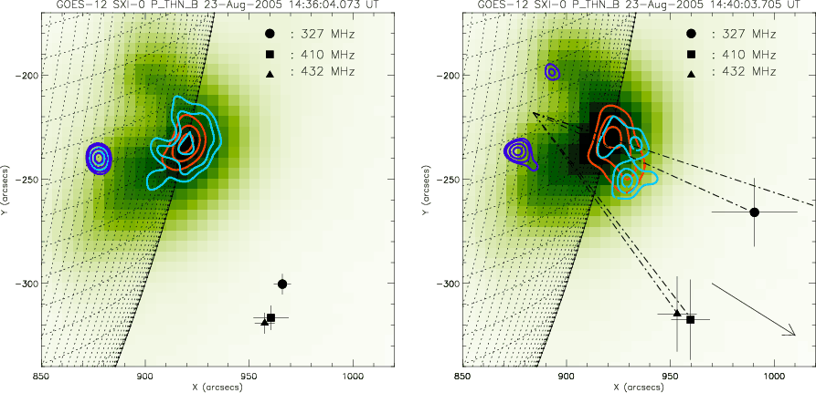 Figure 2: GOES/SXI images taken during time intervals of the spike activity. RHESSI contours of the hard X-ray coronal sources are shown in light gray (light blue in the color version) at 18-22 keV. The RHESSI observations at 6-12 keV (dark gray (red in the color version), thermal) and 25-50 keV (black, footpoints) are also overlaid. The time-averaged centroid positions of the radio sources are indicated with different symbols for the different frequencies. The error bars indicate the standard deviation of the individual source positions. The arrow points in the direction of the CME as seen from Sun center. |