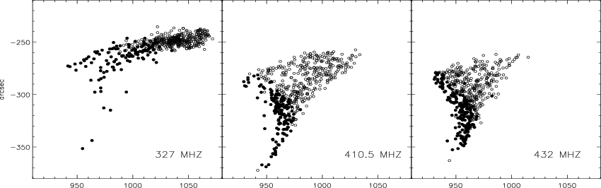 from the perpendicular of the coronal source. The smallest offset is found for the 327 MHz source during the second time interval (8