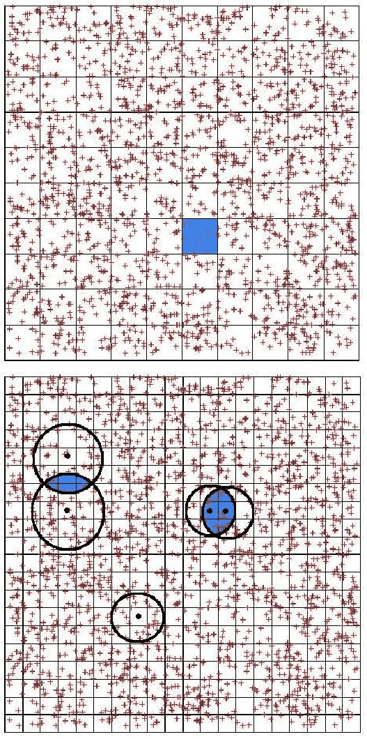 We solve these problems by an adaptive averaging procedure, in which we average galaxy ellipticities within circles around each pixel centre. Their radii are stepwise increased until each circle contains the desired number of galaxies. Different pixels will need different radii, depending on the local galaxy density in that area of the field. On a fine grid, galaxies shared by neighbouring pixels will of course cause these pixels to be correlated (see Fig. 1).