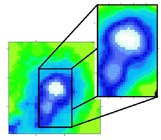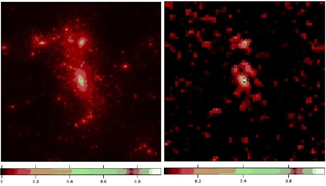 10 pixels, which is of course way too coarse to see any cluster substructures. In addition, pixels of a homogeneous grid can occur which contain fewer than 10 or even no galaxies because of the inhomogeneous, random galaxy distribution.