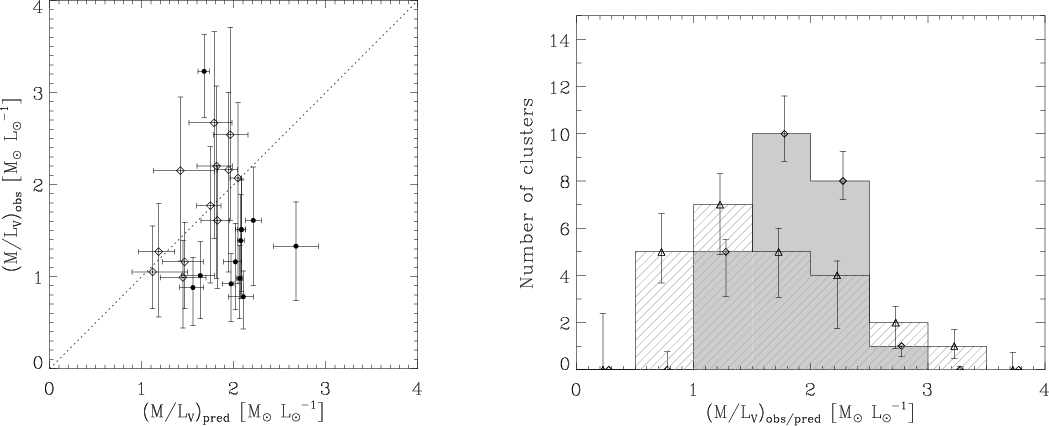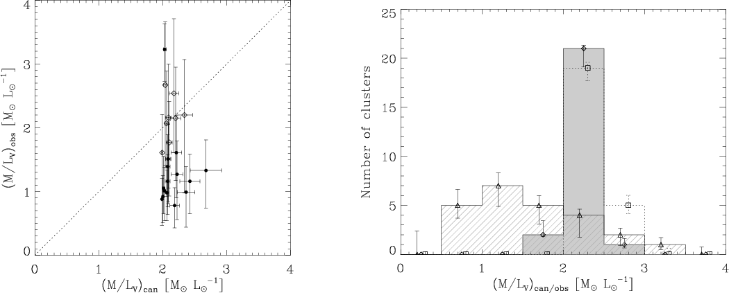 A first inspection of the observed M/LV ratios in Table 1 can be made by comparing them to the (``canonical'') M/LV ratios from SSP models, which only depend on metallicity due to the invariance of the shape of the stellar mass function in these models. In Fig. 1 (left), the observed M/LV ratios of our sample are plotted versus the canonically expected values that were computed by interpolating SSP models. These were emulated with the models from KL08 neglecting the preferential loss of low-mass stars. The discrepancy between observed and expected M/LV ratio is evident, as the canonical M/LV are constrained to a much narrower and generally higher range than the observed ones. The number histogram of the two M/LV (Fig. 1, right) further substantiates this dissimilarity. The observed M/LV ratios are on average 74 +6-7% of the canonically expected values.