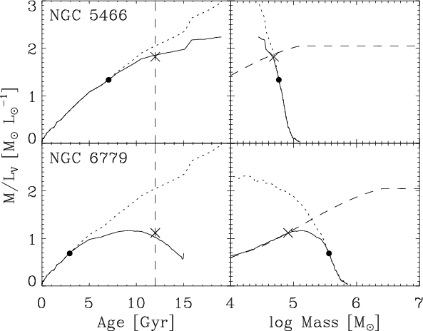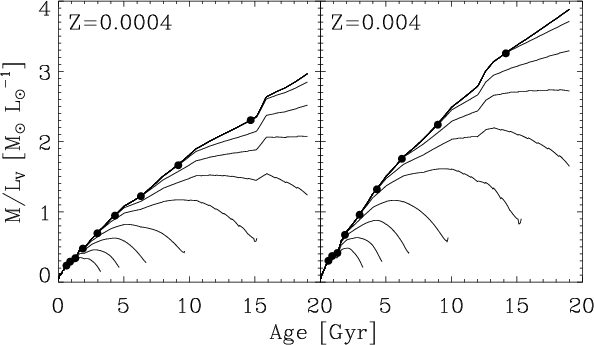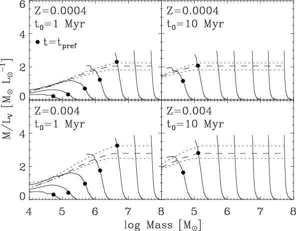 Left: V-band mass-to-light ratio evolution M/LV for t0=1 Myr, Z=0.0004 and initial masses in the range
