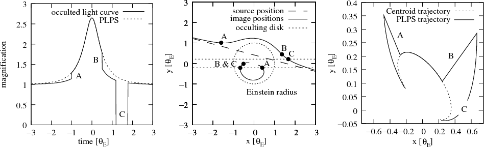 Light curve of the point source point lens model occulted by an optically thick edge-on disk is plotted along with the corresponding source and image tracks and the astrometrically detectable astrometric offset from the source. Features A and B are caused by the occultation of the less magnified image while feature C is obtained from the occultation of both images. The impact parameter is