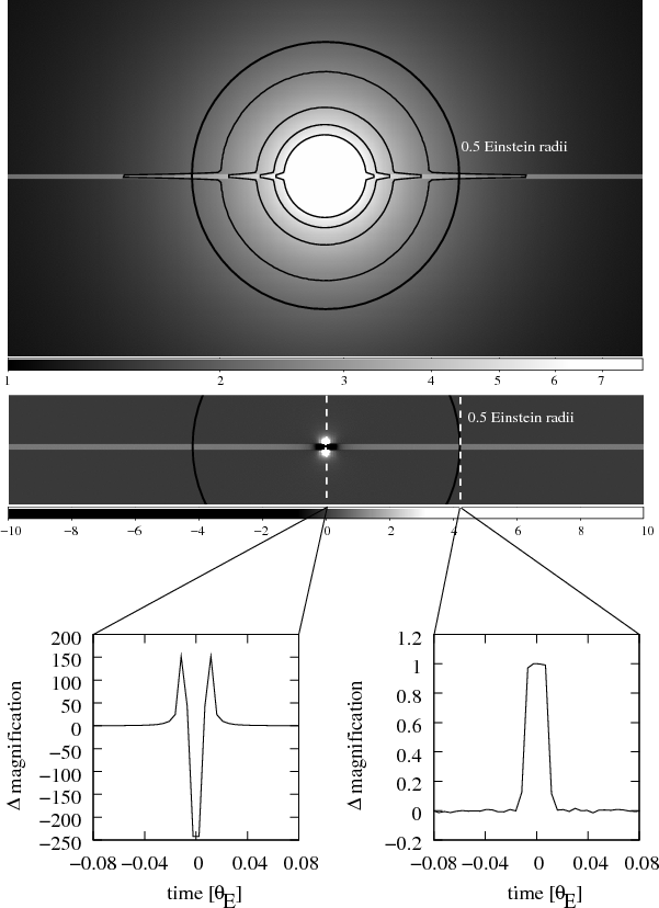 1; hence potentially observable. Close to the linear mass distribution representing the disk, one sees an additional rectangular magnification caused by