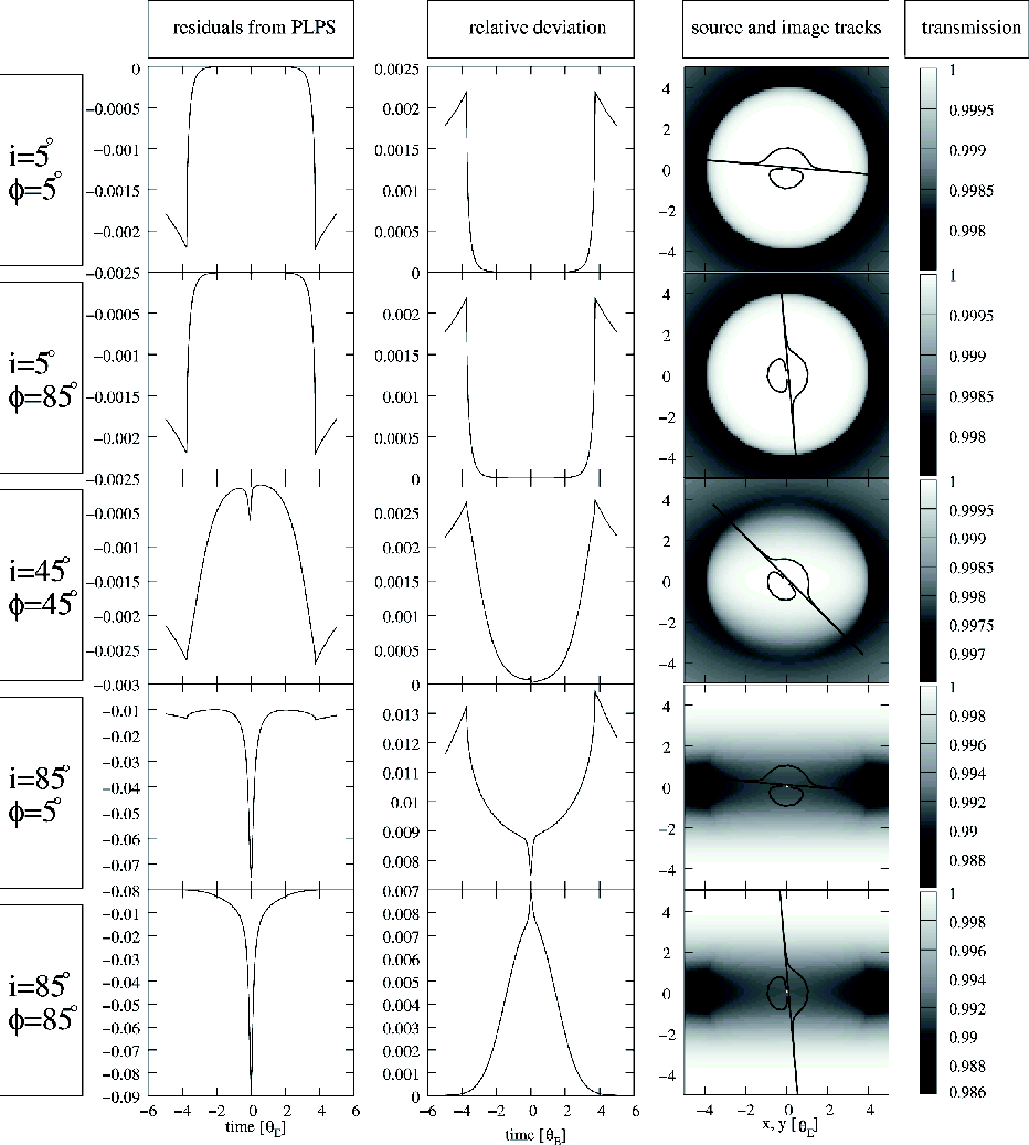 10 AU radius. Simulations for 100 AU and 150 AU show similar results: all of them show a systematic decrease in the residuals close to the maximal magnification, especially at high inclination. The source and image tracks plotted over the map of