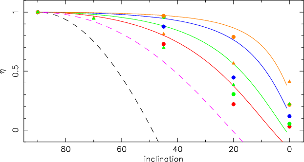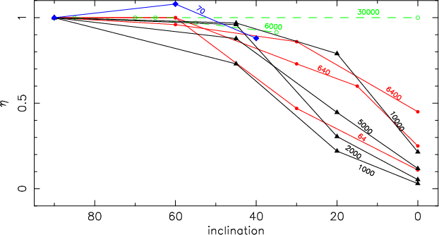 The question of how the orientation of the galaxy relative to the orbital direction influences the final stripping was touched on by many authors (Roediger & Brüggen 2006; Schulz & Struck 2001; Vollmer et al. 2001; Quilis et al. 2000; Hidaka & Sofue 2002; Marcolini et al. 2003). For tilted galaxies the effect of the hydrodynamical shielding is more pronounced in comparison to the face-on case and yields weaker stripping. Moreover, due to galactic rotation, near edge-on ram pressures evoke asymmetric shapes of the ISM disks (e.g. Roediger & Brüggen 2006). From previous simulations, only close-to edge-on orientations were identified as less efficient in the stripping than face-on cases (Roediger & Brüggen 2006; Quilis et al. 2000). The tilted stripping was found to be delayed compared to face-on (Vollmer et al. 2001), and takes a longer time (Farouki & Shapiro 1980). Other features, like tails of stripped material forming on the disk side where the gas rotates against the wind (Phookun & Mundy 1995), or annealing of inclined galaxies by a stronger loss of angular momentum (Schulz & Struck 2001), were noticed. Mimicking the hydrodynamical shielding of tilted galaxies with a simple geometrical prescription, Vollmer et al. (2001) performed a set of sticky-particle simulations with time-varying ram pressure peaks. Roediger & Brüggen (2006,2007), using hydrodynamical adaptive-mesh-refinement simulations, introduced models of galaxies experiencing a constant ICM flow in a periodic boundary box, or orbiting on realistic orbits in clusters.