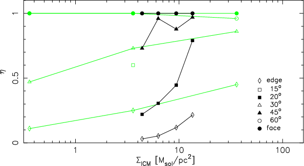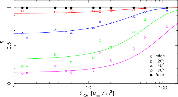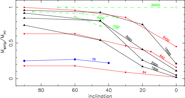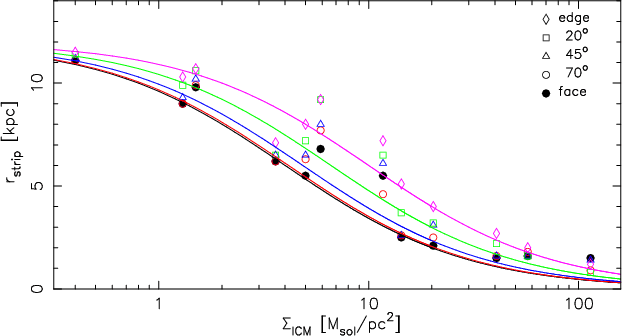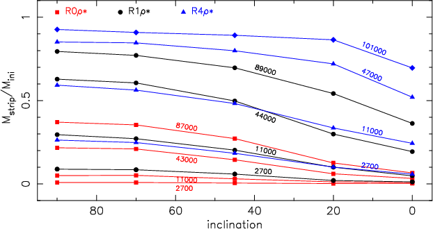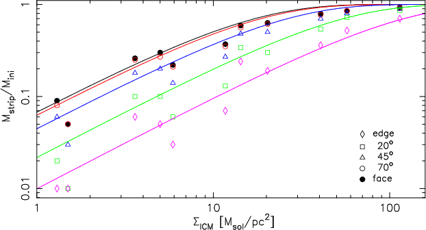 - for non-face-on orientations, the sense of rotation plays a role: contrary to expectations, it is not the side with highest ram pressure which is more stripped;