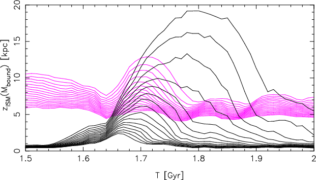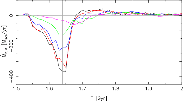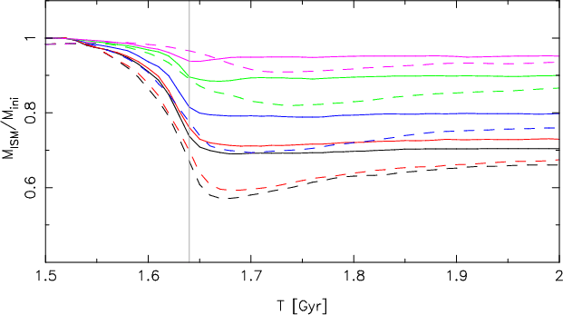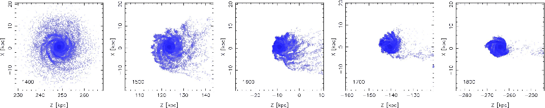 The model galaxy initially starts with zero velocity from the cluster periphery (R=1 Mpc) and freely falls along a strictly radial orbit towards the cluster center. In the standard model the galaxy reaches the center at time T=1.64 Gyr with a velocity of about 1300 km s-1. The simulation is followed until T=2 Gyr when the galaxy has already left the central part of the cluster filled with ICM particles. Thus, each simulation run corresponds to one orbit of the galaxy through the cluster center.