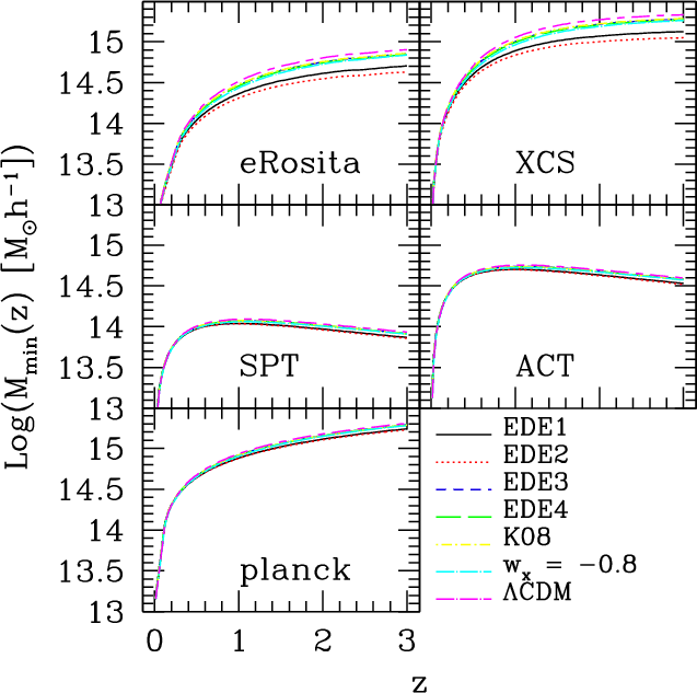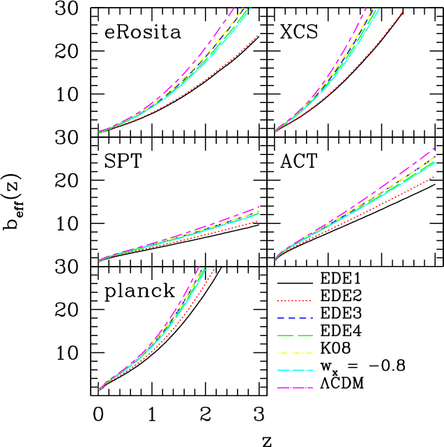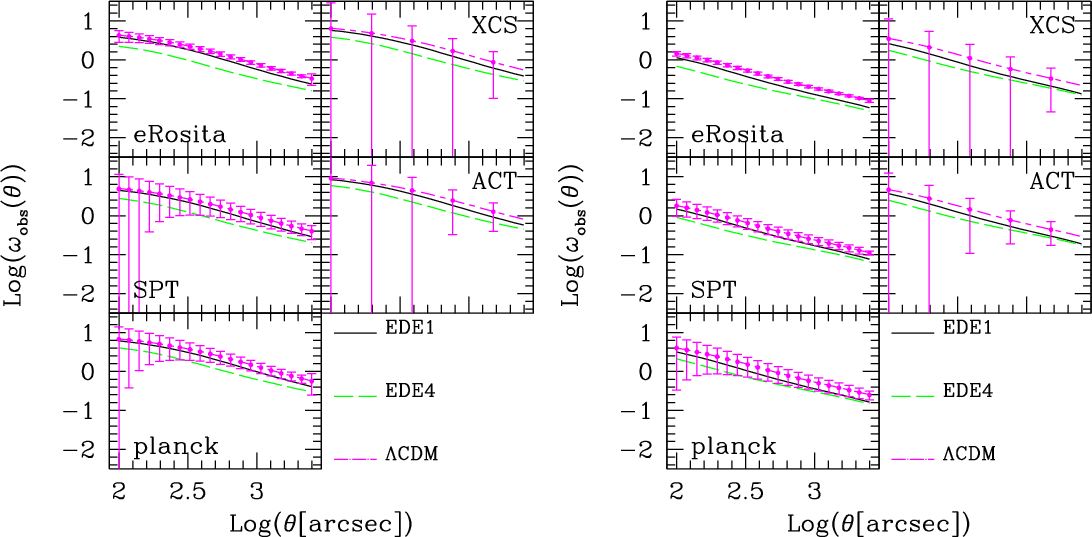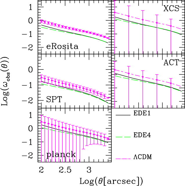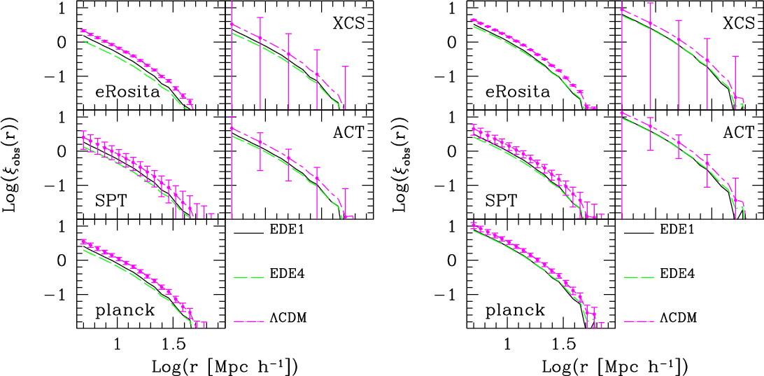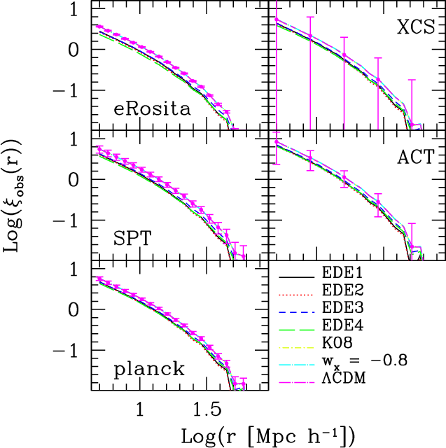 with time. Sadeh et al. (2007) performed a simple preliminary study of the two-point angular correlation function predicted to be observed by Planck in models with early quintessence. As will become evident from the results shown in this paper, our findings are qualitatively consistent with those, while a quantitative comparison is not directly possible because of the different catalog definitions. Observational results about the clustering properties of galaxy clusters measured in optical and infrared catalogs can be found in Brodwin et al. (2007), Papovich (2008) and Estrada et al. (2008).