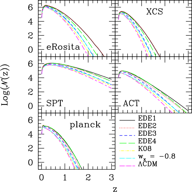 in model EDE4, necessary to counter act the quite high dark-energy density at early times, which in turn determines a particularly low linear density contrast threshold for spherical collapse. As can be seen from Fig. 1, all our models approach the cosmological-constant behavior at low redshift, and they are all constructed to also be in agreement, beyond CMB data, with large-scale structure (Tegmark et al. 2004a,b) and type-Ia supernovae data.