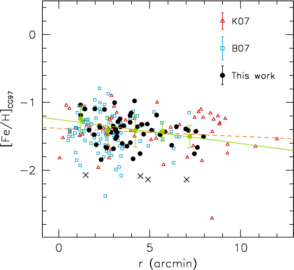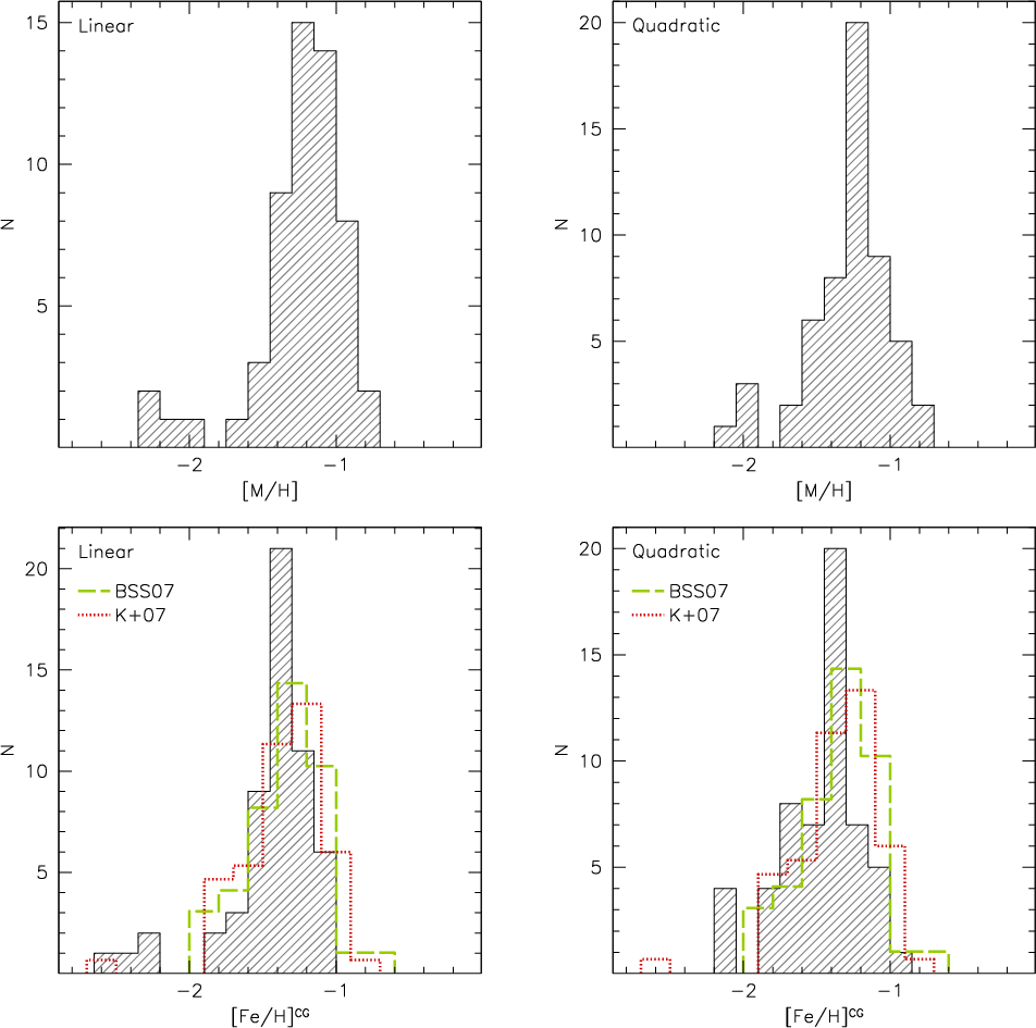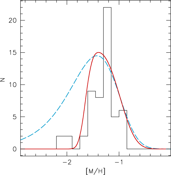 ). Also using measurements of the Ca II triplet lines, Koch et al. (2007b) found a mean metallicity [Fe/H] = -1.31 on the CG97 scale for 58 red giants. In both studies, the MDF is well described by a Gaussian function with a 1