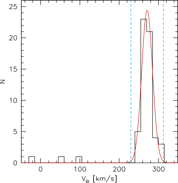 Then, the radial velocity was calculated as the mean of the two values independently measured from the single spectra. The results, corrected to heliocentric velocities using the rvcorr task, are given in Table 1. The distribution of radial velocities, shown in Fig. 4, is well fitted by a Gaussian function centred at 271 km s-1 with a dispersion 13.7 km s-1. All but three stars have heliocentric radial velocities within
