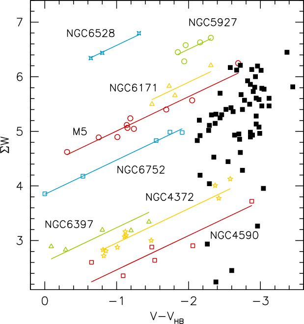 The sum equivalent widths are given in Table 3 for the red giants in Leo I and in Table 4 for the RGB stars in the template GCs.