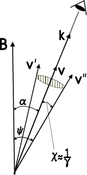 Figure 1: k is the emission direction, B the magnetic field line, v, v' and v'' are the electron velocity vectors. |