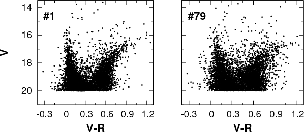 Figure 1: Color-magnitude diagrams for the stars analyzed in this paper in the LMC fields #1 and #79. Data were cut at V=20 mag. |